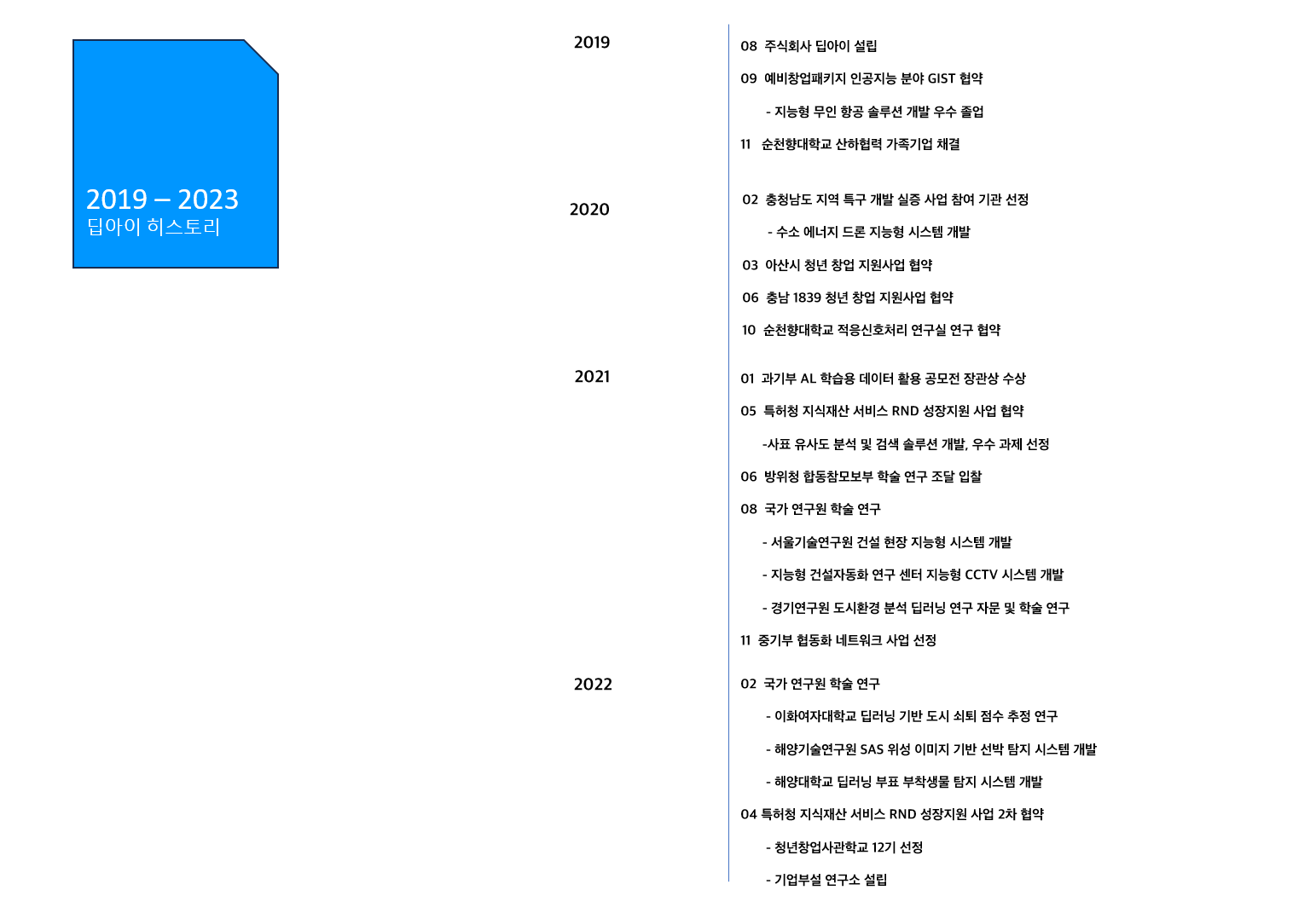 딥아이는 2019년 법인 설립 이후, AI 솔루션을 다양한 기관에 공급하고 있으며, 지자체와의 핵심 임프라 구축을 통해 비즈니스 모델을 확장하고 있습니다.